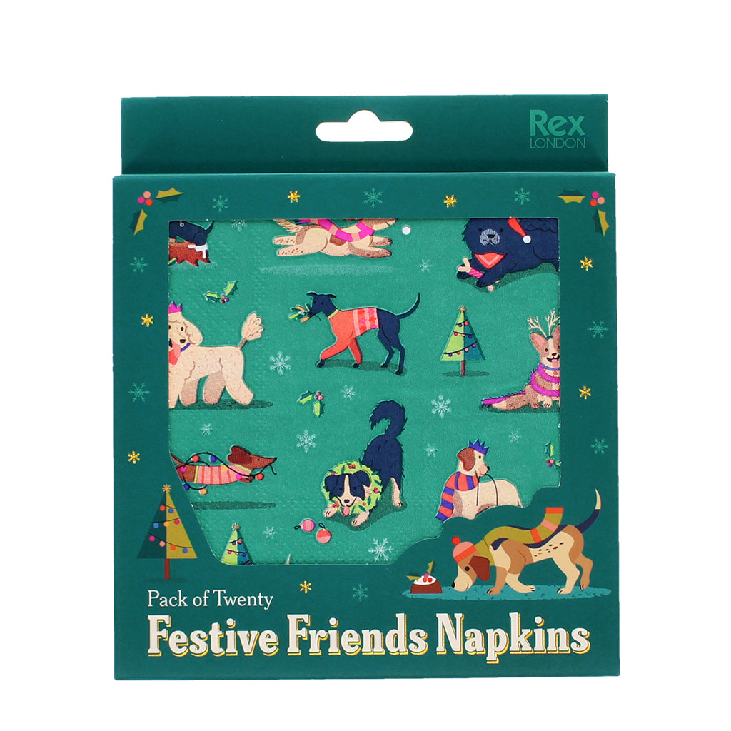 Pack of 20 napkins, each featuring a playful yuletide design: an adorable array of dogs in festive attire, up to all sorts of Christmassy mischief. Perfect for adding a fun touch to the table setting for Christmas dinner.