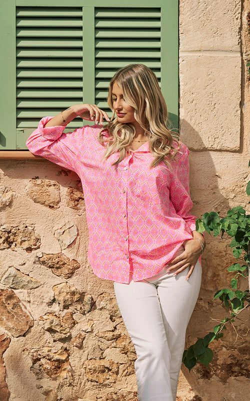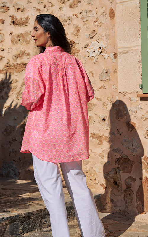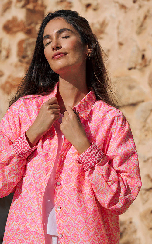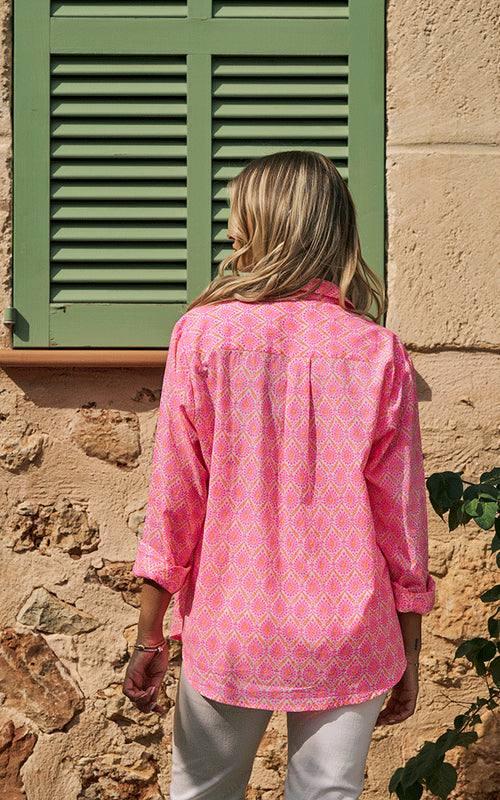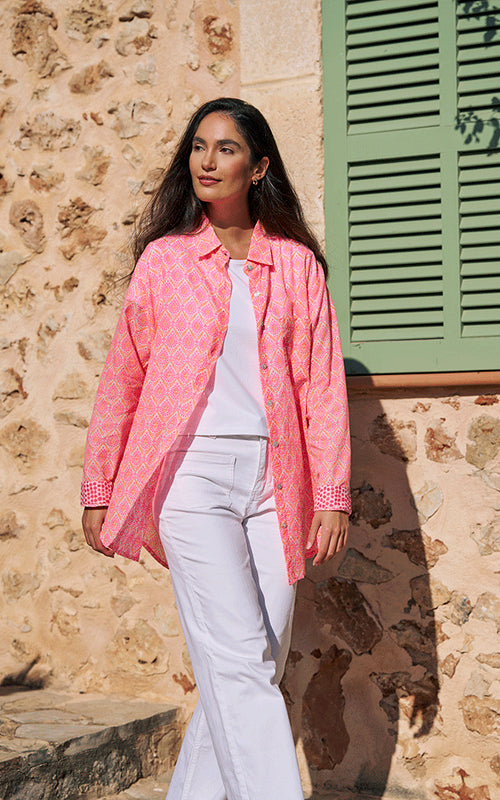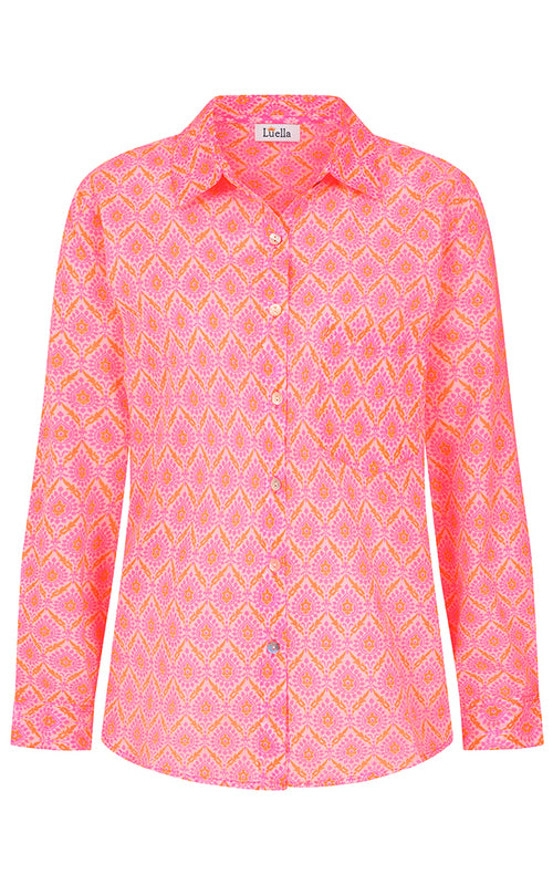 With its relaxed fit and bold neon pink and orange print, the Montpellier Cotton Shirt is quintessentially Luella. Contrast cuffs and delicate detailing bring a signature feminine touch to this standout piece.